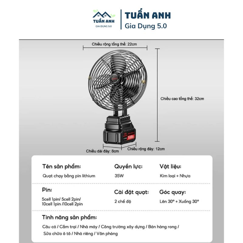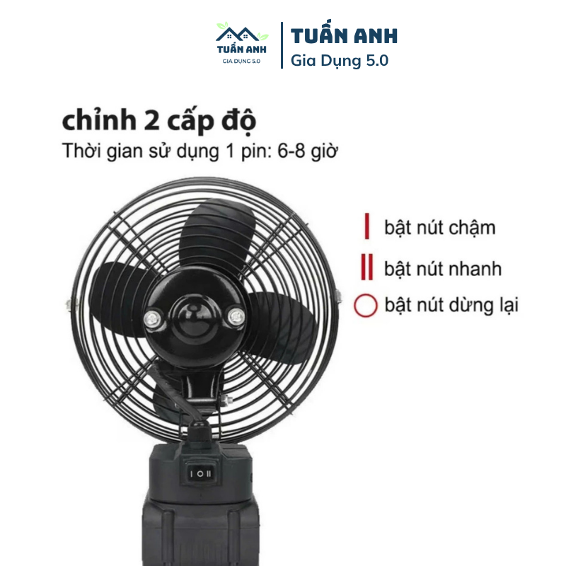 ✔ Giúp bạn sử dụng được với nhiều loại pin thông dụng. Quạt có chân pin phổ thông, cho phép bạn kết nối với các loại pin 10 cell hoặc 15 cell có sẵn trên thị trường. Bạn cũng có thể sử dụng pin sạc để tiết kiệm chi phí và thân thiện với môi trường.